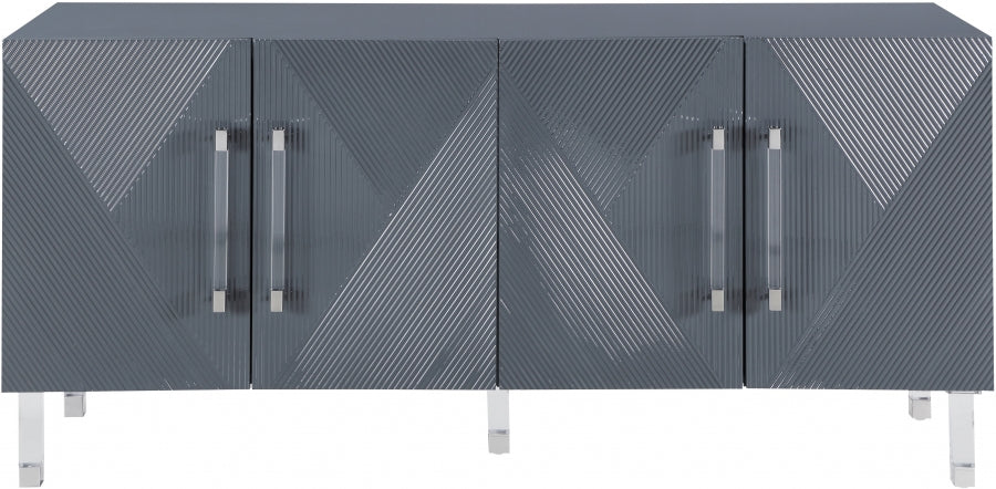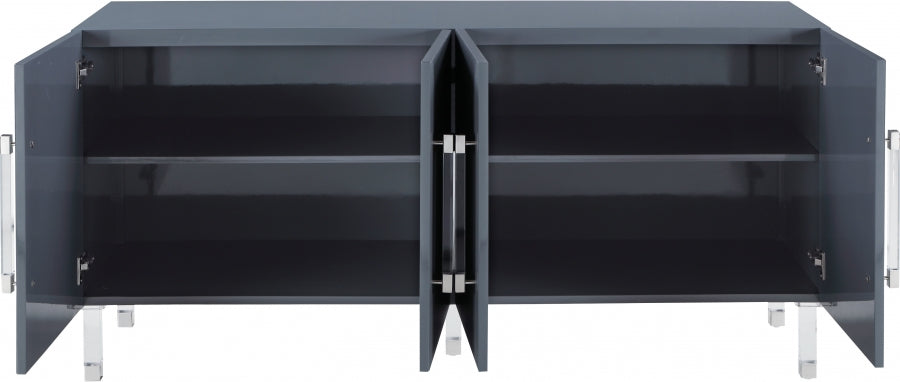 Make a bold statement in your living space with this eye-catching Florence Sideboard/Buffet from Meridian Furniture. Its grey lacquer is complemented by a chrome finished base, creating a contemporary design that's both modern and stylish. Four side cabinet doors open up to reveal four cubby spaces, giving you ample room to safely tuck away dishes, pots and pans, knick-knacks, books, or other household items, while the top of the sideboard/buffet doubles as shelf space for items you want on display.