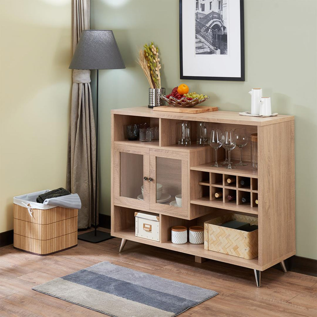 Store your beloved wines with this classic but trendy rectangular Hazen server to have them ready anytime. This server has 2 glass front doors , 4 compartments, wine rack and steam ware glass rack, providing plenty storage space for your convenience. Keep it close to your dining table to tuck away glasses, napkins and other essentials. Finished with rustic oak wooden frame, it will fit naturally in any design.