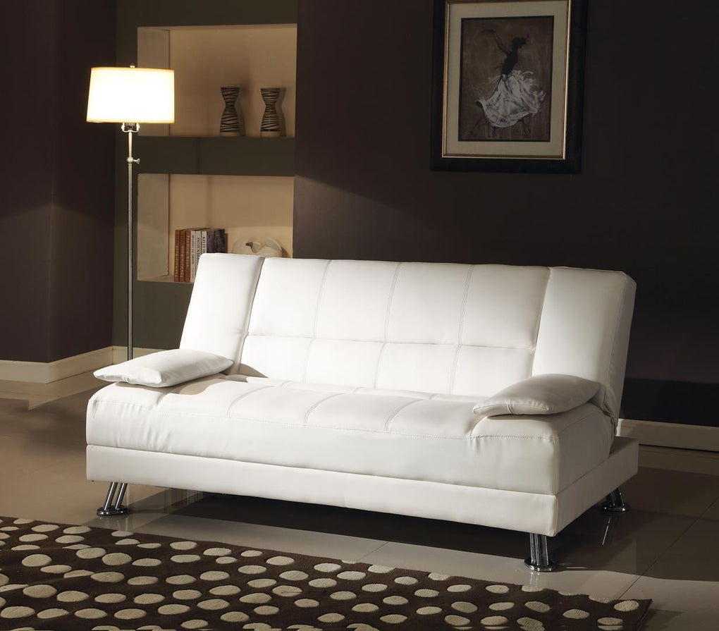 The Fae Collection features a Modern-Contemporary look, ideal for those wanting a cozy but sleek furniture piece to add to their living room; while maximizing the small spaces and maintaining style. The Adjustable Sofa comes in a White PU Finish, tufted cushions, metal legs and 2 accent pillows complement the contemporary look. It's adjustable feature allows to switch from a sit to sleep position by simply lifting the light weight seat cushion; a quick and easy transformation into a ready to use bed. You will not find a better set that fits both style and comfort for the price.