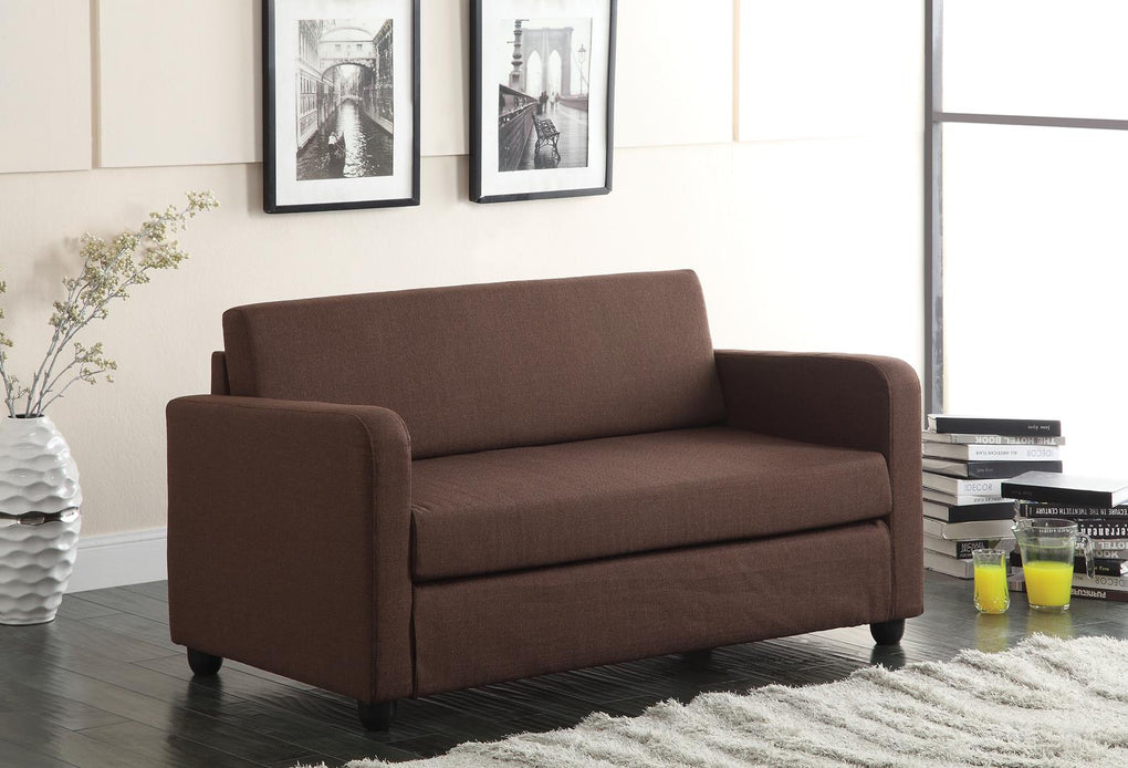 The Connall Adjustable Sofa Collection features a Contemporary look, ideal for those wanting a cozy but sleek furniture piece to add to their living room; while maximizing the small spaces and maintaining style. The Adjustable Sofa comes in chocolate fabric upholstery, reflecting a streamlined seat and back cushions, and sleek track arms complements the contemporary look. It's adjustable feature allows to switch from a sit to sleep position by simply lifting the light weight seat cushion; a quick and easy transformation into a ready to use bed. You will not find a better set that fits both style and comfort for the price.