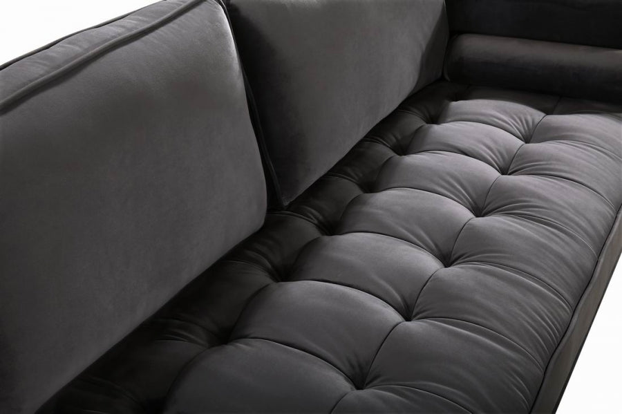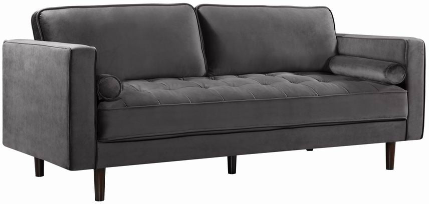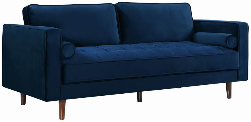 Stretch out and relax on this handsome Emily sofa. This Meridian Furniture sofa features wooden legs and a sturdy frame, so it's built for the long haul. Its vibrant navy velvet upholstery is a jewel tone that's simply stunning and that adds a pop of color to your day. The sofa's back cushions are plump and filled with premium material to cradle you in comfort, and it comes with two roll-style pillows for helping you prop up and unwind.