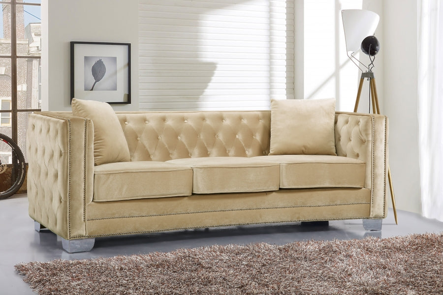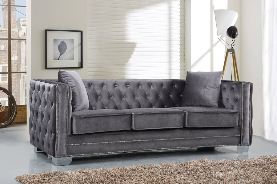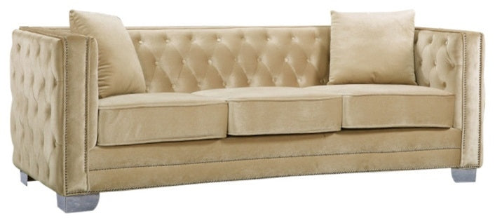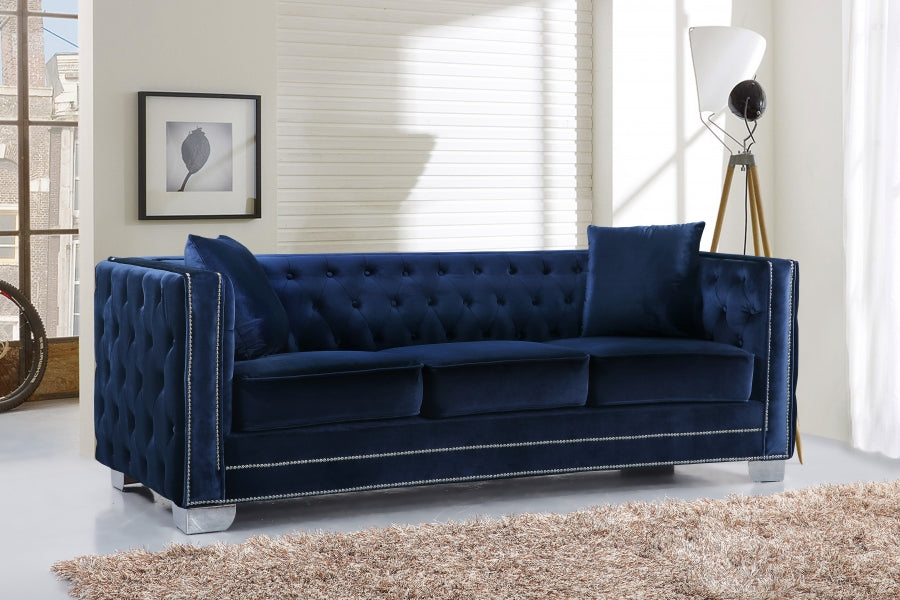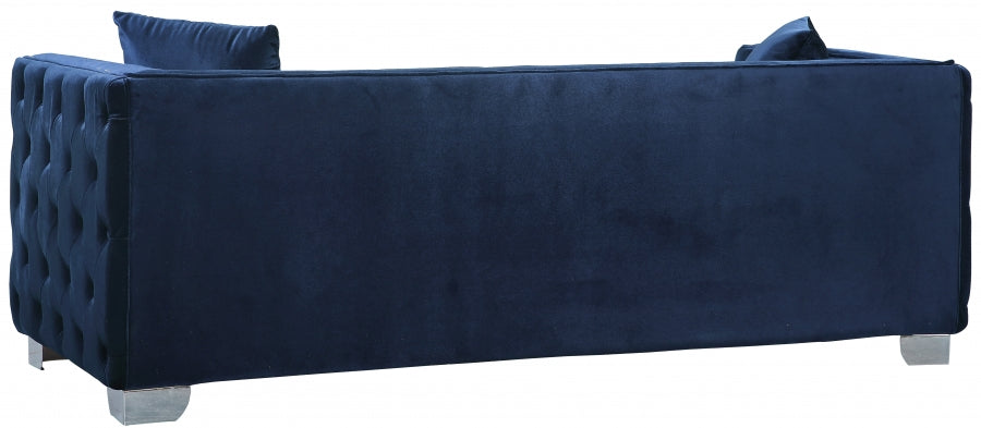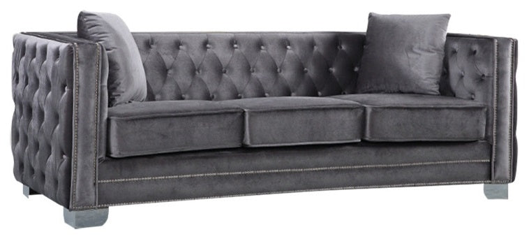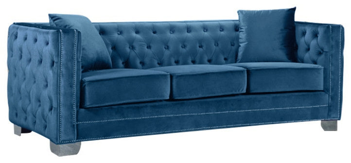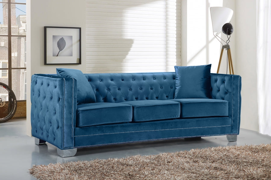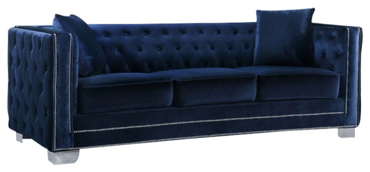 Elegant and eye-catching, the stunning Reese Living Room from Meridian Furniture is the perfect addition to any space. Rich Velvet covers the plush, comfortable seat, padded with high-density foam and modern tufted design on the back and sides. Strength and beauty is guaranteed with a solid wood frame and chrome legs. Featuring a Unique slightly curved design and nail heads.
