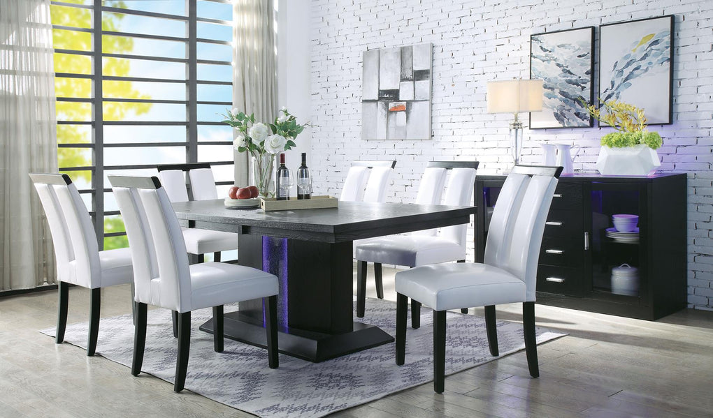 Add a modern touch to your dining room with the Bernice dining table. With a stunning black finish and frosted glass top, this beautiful rectangular pedestal table features unique LED lighting. Its spacious glass top reveals the gorgeous tabletop and pedestal base and helps to keep your room feeling open and refined.