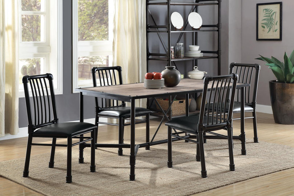 This contemporary Caitlin dining set is perfect for any gatherings. The rectangular dining table in rustic oak finish features an interesting metal pipe designed bottom. The side chairs feature slatted back, metal pipe frame and upholstered seat covered in black faux leather.