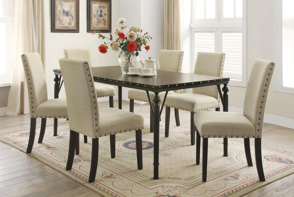 The Hadas collection will make the most out of your dining room. This table has a very unique look that is casual yet traditionally-modern. It is supported by a metal frame and a signature Nailhead trim accent. The walnut finish wooden table top provides a great space to enjoy a drink or meal. Parson chair comes with padded seat and backrest cushion for extra comfort. With such versatile style this set can be incorporated into any room setting.