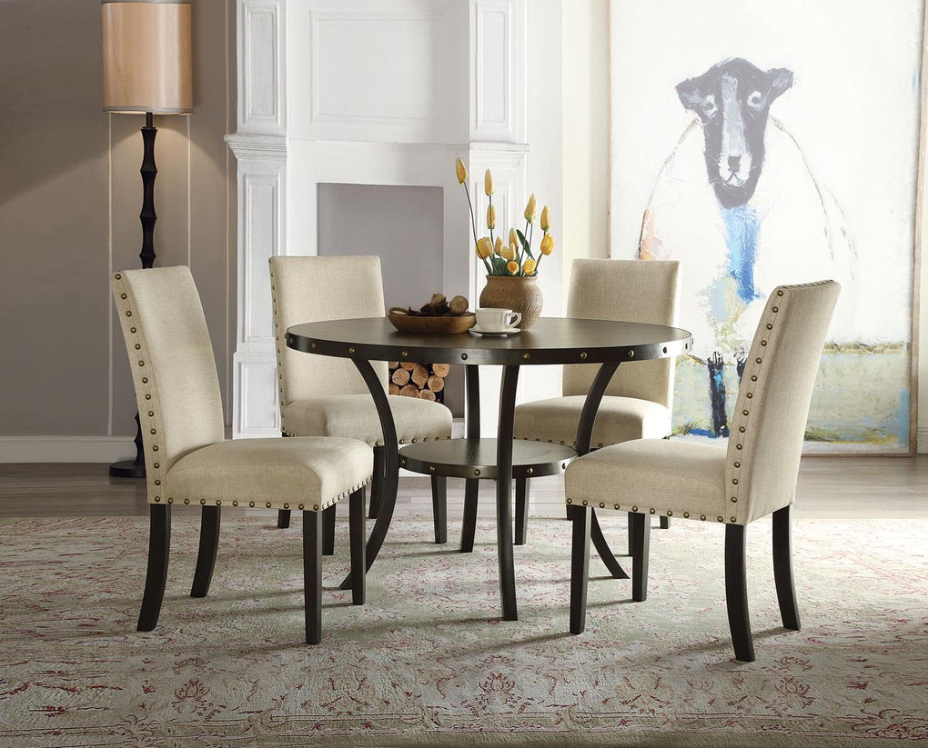 The Hadas collection will make the most out of your dining room. This table has a very unique look that is casual yet traditionally-modern. It is supported by a metal frame and a signature Nailhead trim accent. The walnut finish wooden table top provides a great space to enjoy a drink or meal. Parson chair comes with padded seat and backrest cushion for extra comfort. With such versatile style this set can be incorporated into any room setting.