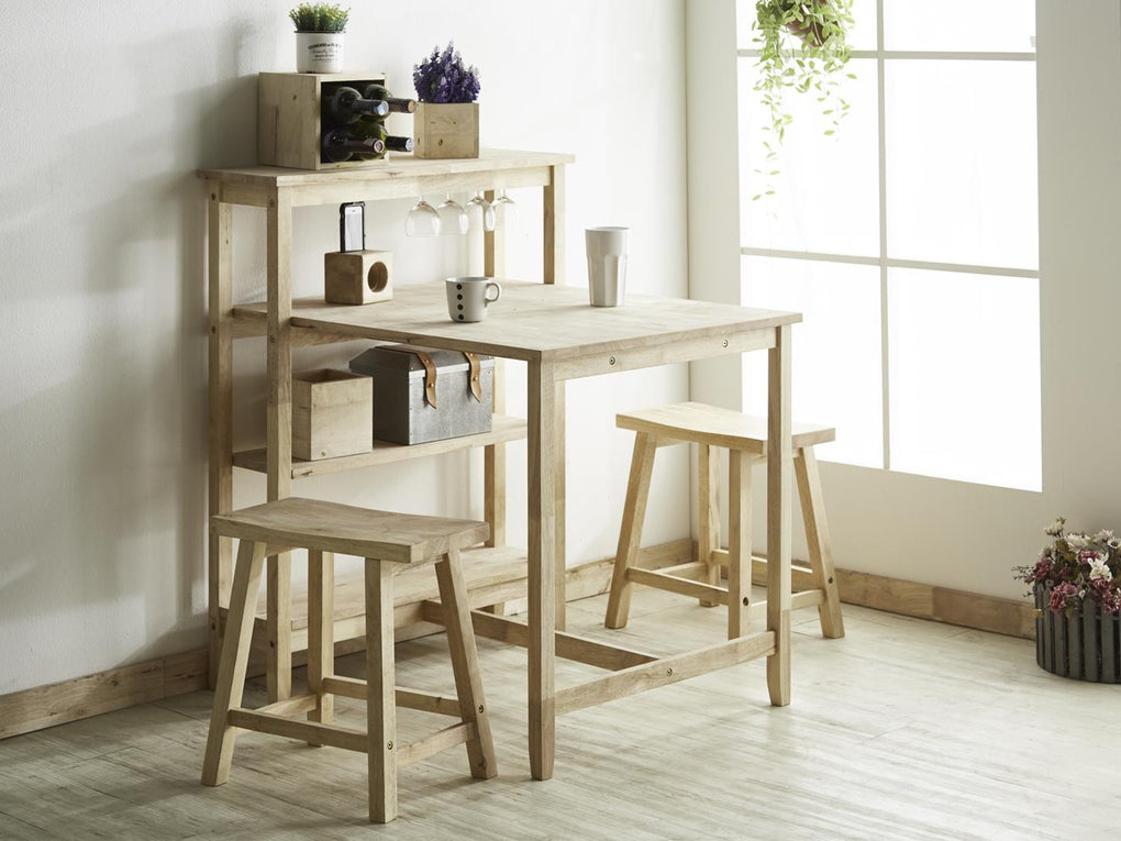 Space saver and functionality make this an outstanding dining set. It includes a table and 2 saddle seat stools. The unique aspect of this table is that a 4 shelved open storage rack at the end of the table and is the support for that end. The rack can be against the wall or at the end of the table, depending on which way you rotate. This dining set will update your dining options and bring some European flavor into your Decor, with its natural finished wood.