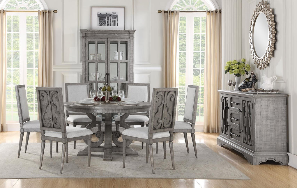 Combining classic and contemporary elements, the bold curves of the Artesia dining room collection provide both an elegant contrast and a unique look to any dining area. The beautiful round pedestal table features a wood base with decorative scrolled motifs in a "salvaged" natural finish. This stunning collection will inspire a timeless look that will endure for years to come.