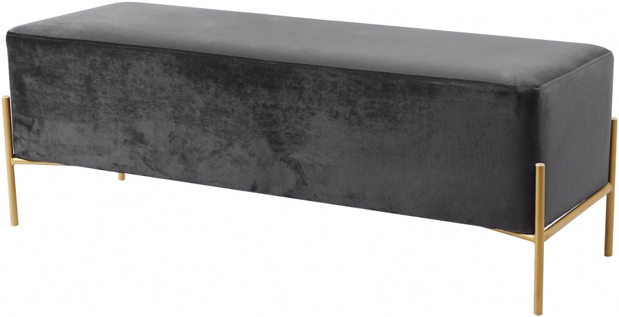 Add the chicness of black and gold to your bedroom or dressing room with this Isla black velvet bench. This oversized bench is just right for placing at the foot of your bed, giving you a spot to rest while you put on your shoes or read before bed. The sleek black velvet upholstery feels rich to the touch and adds an upscale look to this piece and feels buttery soft beneath your skin. The gold tone base offers reliable support and gives the bench durability, so it lasts and lasts in your home.