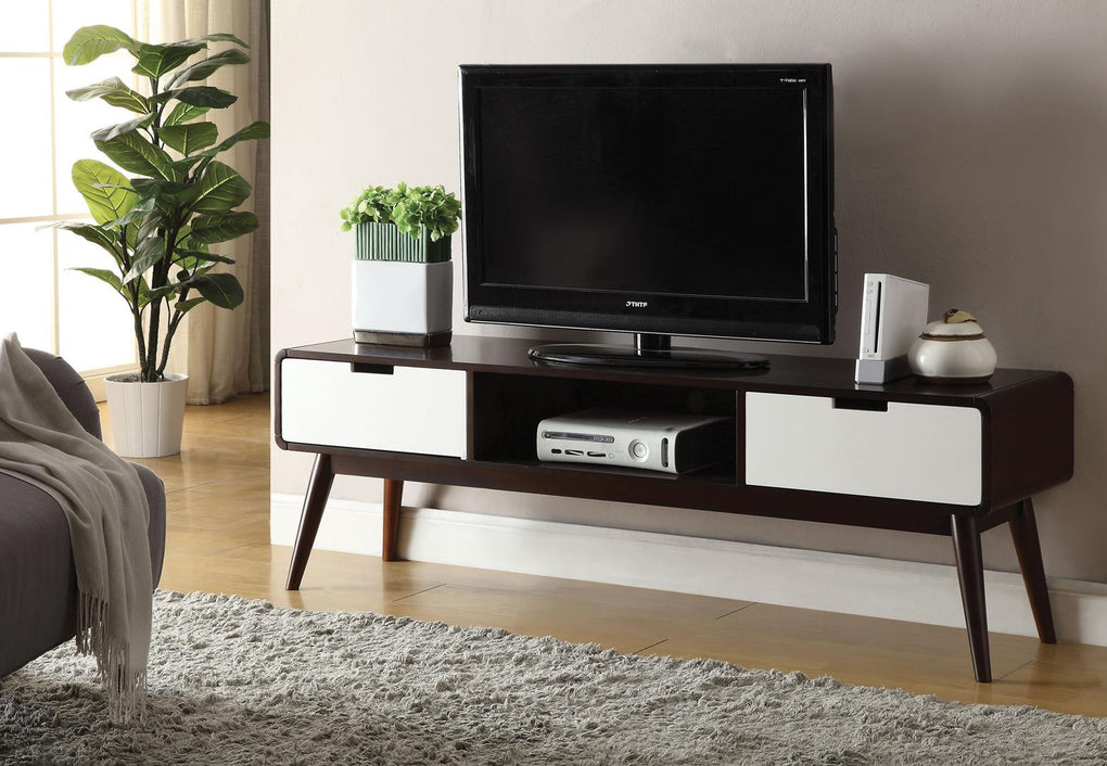 Own the highly sought after mid century modern look with updated color combination of the Christa TV Stand, taking the finish dark and adding a high contrast look with white drawers. This TV Stand has style and plenty of function. The drawer cut out is to mineralize the look and keep it simple, while having open space in the middle for components.
