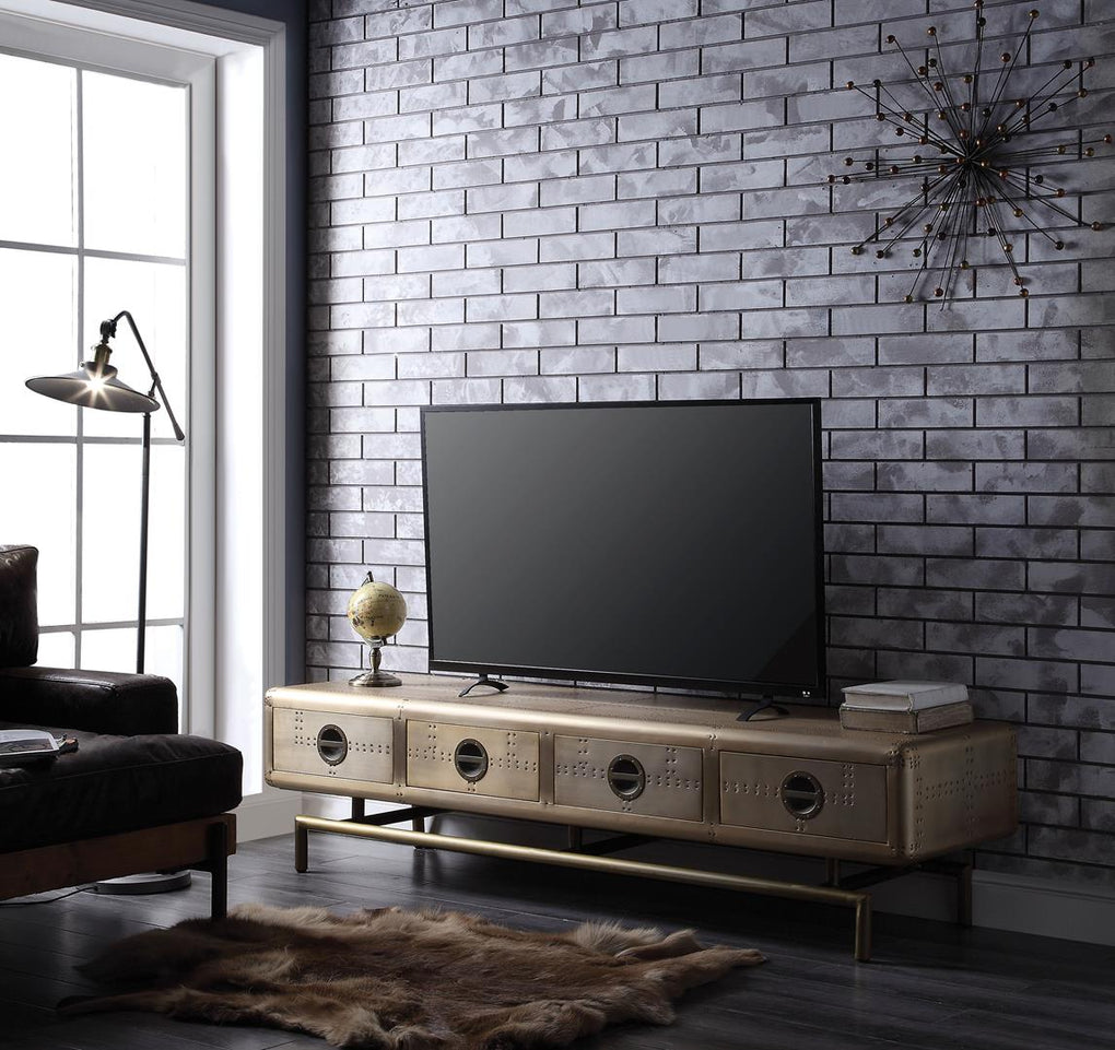 Redefine your space with a modern look and industrial styling with the Jennavieve TV stand. This rectangular trunk style table features magnificent gold aluminum patchwork with 20th-century riveting details, on top of a unique geometrical metal base. The stunning table is accented with four storage drawers and pull cup handle giving it sleek lines. This beautiful TV stand will modernize any space you place it.