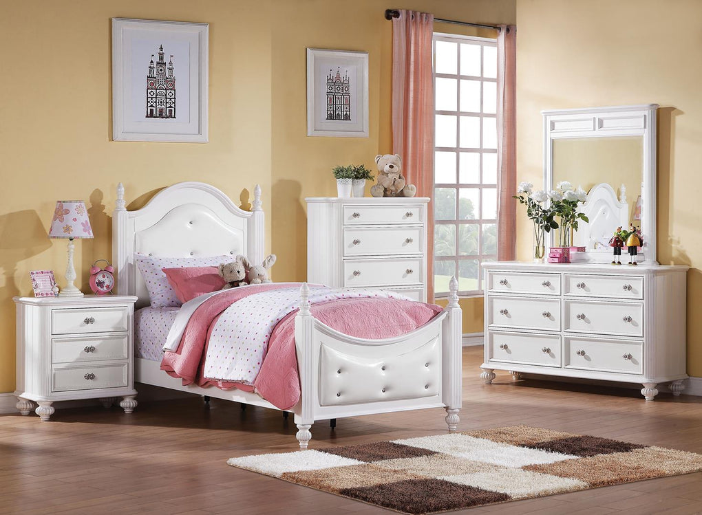 The Athena girl's bedroom collection features shaped and profiled head/footboard with accommodating trundle. Complementary cases include trim molding drawer fronts, decorative crystal like knob hardware, pumpkin bun feet and white finish throughout. This beautiful girl bedroom is perfect for your favorite girl.