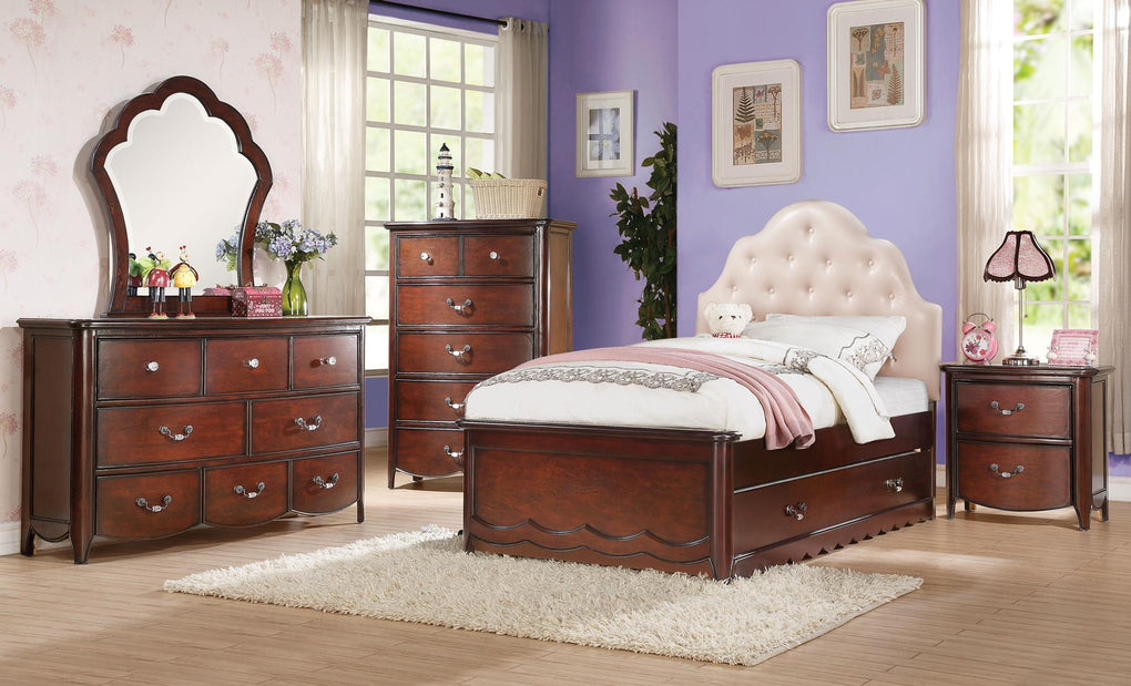 The Cecilie collection is fantastic for every girl's room. The collection offers both white wooden panel or Light Pink PU headboard choices, curvy pattern throughout bed and case pieces to create the feminine appeal. The dovetail drawers and Felt-Lined design enhance the durability and functionality. This collection is available in both white and cherry finish.