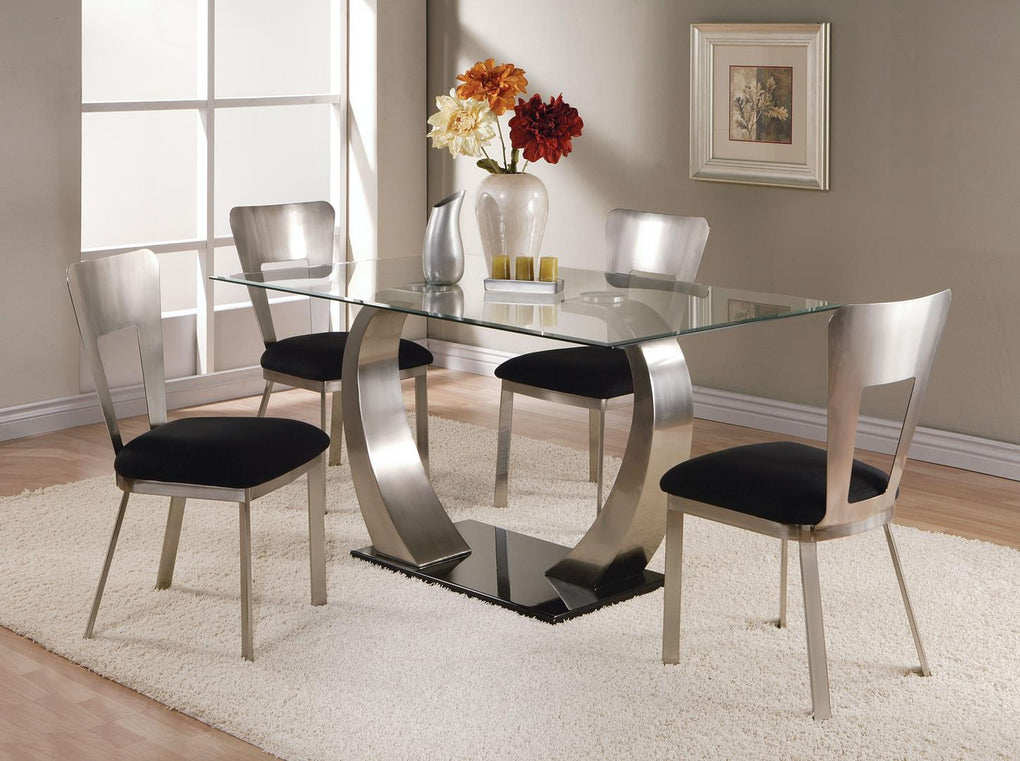 The collection Camille is a modern and brilliant for the house. The dining set features glass table top with metal plate, and the matching chair uses black microfiber .This elegant set will bring sophistication to any home.