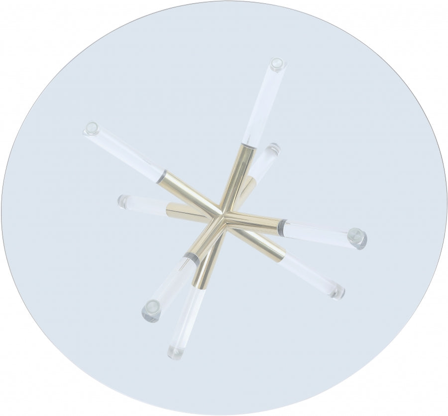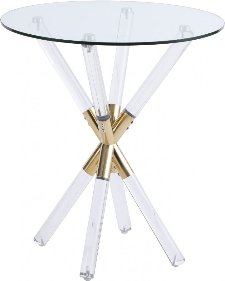 Bring modern pizzazz to your living room with this Mercury Acrylic Gold End Table by Meridian Furniture. The base features a pedestal design with acrylic gold legs for a touch of contemporary fun. The tempered glass top offers plenty of room for holding items like framed pictures or magazines. The top is clear, so you can easily see the beauty of the metallic legs showing through, giving your living room or den a little something extra.