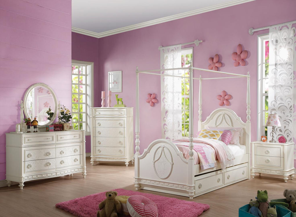 Bring home this dreamy and elegant Dorothy collection. The collection is constructed with solid pine wood with ivory finish, and has post bed and fully upholstered bed available. The panel bed has optional trundle bed to create more space, and the upholstered bed features crystal-like button tufted throughout. All girls will love the elegance found in this collection.