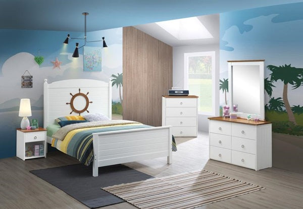 The Farah youth bedroom collection is the perfect addition to any child’s room. This cottage style bed features a panel headboard with low profile footboard, crafted with a timeless look that is an ideal addition to any bedroom. The bed is accented with square legs and a horizontal slatted design and turned posts in an understated white finish. The bed’s nautical design will go with various styles of case good finishes and will become the focal point for your kids bedroom.