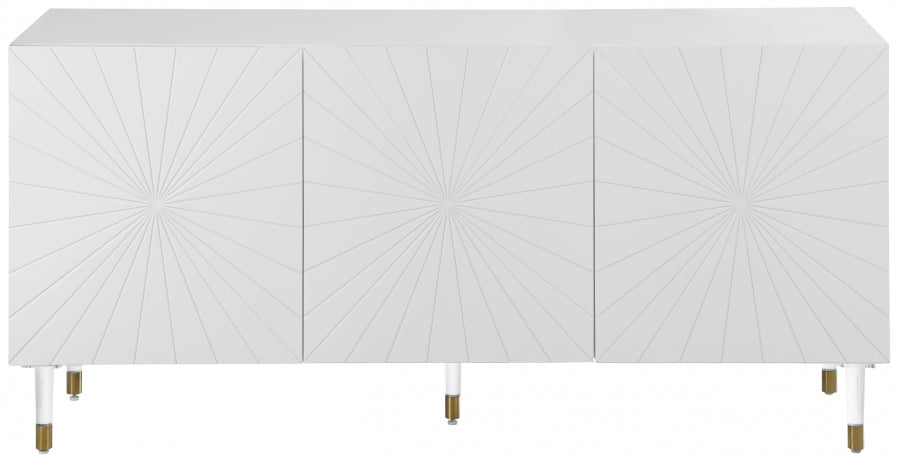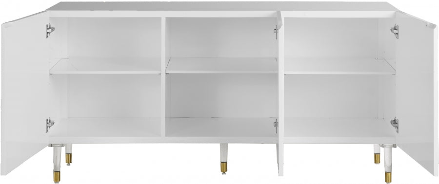 Make a bold statement in your living space with this eye-catching Florence Sideboard/Buffet from Meridian Furniture. Its white lacquer is complemented by a gold finished base, creating a contemporary design that's both modern and stylish. Four side cabinet doors open up to reveal four cubby spaces, giving you ample room to safely tuck away dishes, pots and pans, knick-knacks, books, or other household items, while the top of the sideboard/buffet doubles as shelf space for items you want on display.
