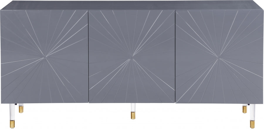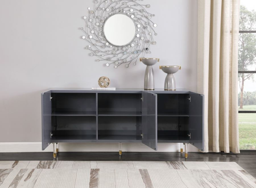 Make a bold statement in your living space with this eye-catching Florence Sideboard/Buffet from Meridian Furniture. Its grey lacquer is complemented by a gold finished base, creating a contemporary design that's both modern and stylish. Four side cabinet doors open up to reveal four cubby spaces, giving you ample room to safely tuck away dishes, pots and pans, knick-knacks, books, or other household items, while the top of the sideboard/buffet doubles as shelf space for items you want on display.