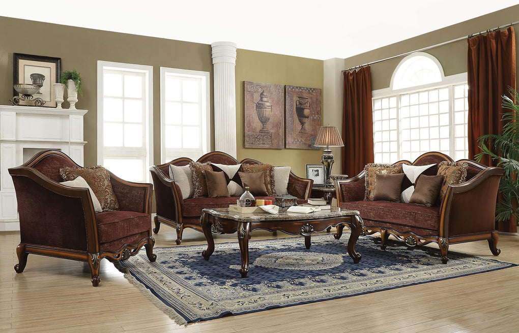 This stylish and delicate sofa set blends classic antique oak color and curved backrest elements into one. The light two tone contrast gold-brush antique finished, classical fabric covered side arm and plush seat support you in lavish comfort and extraordinary style. Add this beautiful set to your living room to create a romantic and stylish space that everyone will admire.