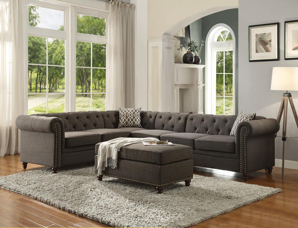 The Aurelia II sofa collection features decorative Nailhead trim and slightly curved on armrest and ottoman. This sofa combines clean, classic lines with retro details, like tufted back and wooden tapered legs.