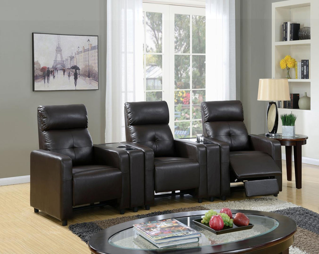 The Britten home theater set is constructed with expresso PU. This modern collection features tight back and seat cushion, with a contemporary style design and convenience cup holder console, fits every living room.