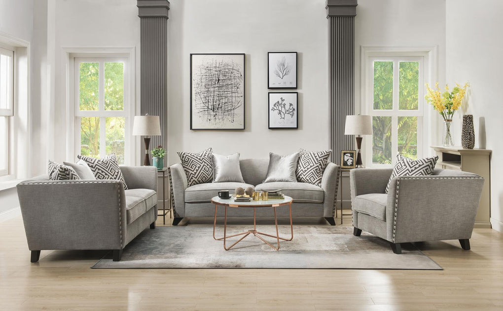 Enjoy every inch of comfort in the Cheyenne chair. Boasting a plush light gray chenille that will create a warm look in your home. This beautiful chairs soft cushions will surround you providing comfort and relaxation in all the right spots. You will love the casual elegance which emerges from sheltered arms with nailhead trim on front and top that embrace modern style. This chair with contrasting accent pillows will bring contemporary sophistication to your living room. This stunning collection will truly inspire a look that will endure for years to come.