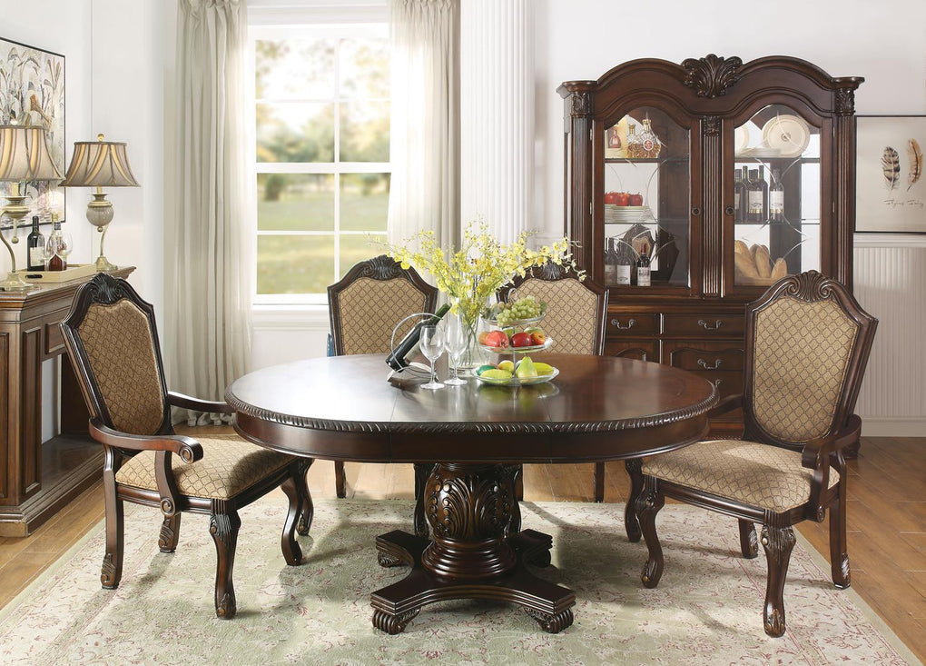 The Chateau De Ville traditional dining table features elegant styling, decorative carving and a combination of exotic materials. The single pedestal dining table with extended 2 leaves is accented by decorative base and feet. This collection will be the showpiece of your dining room environment.