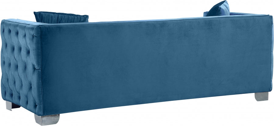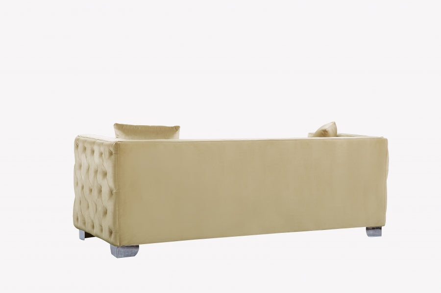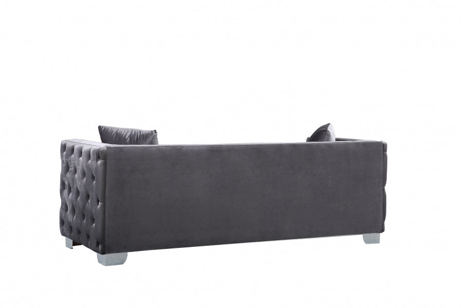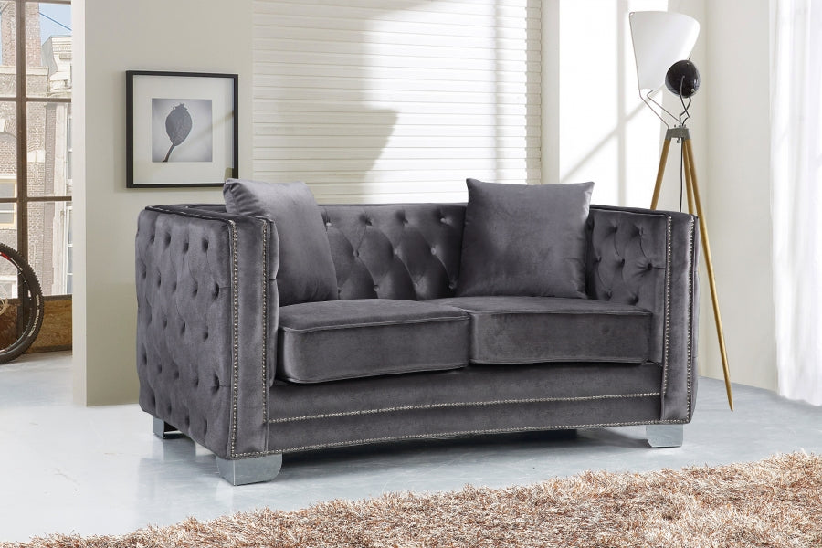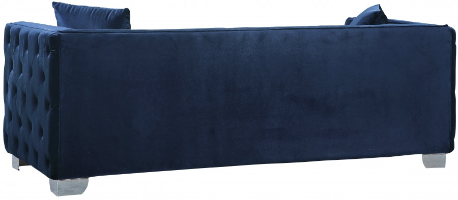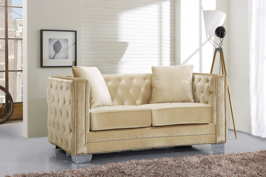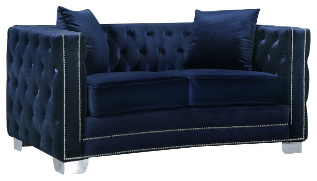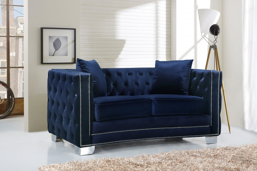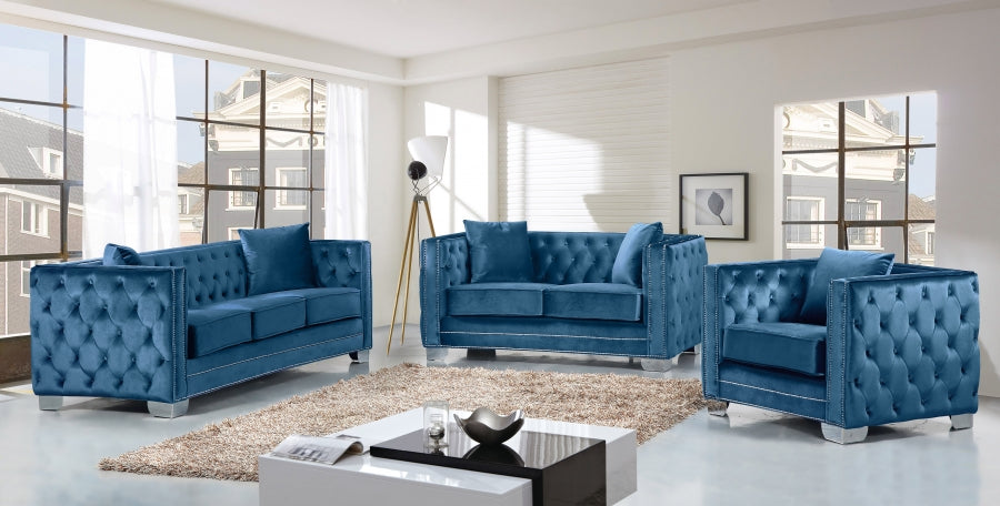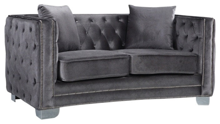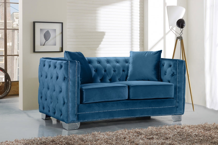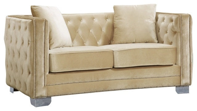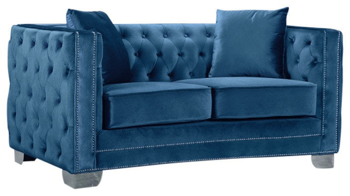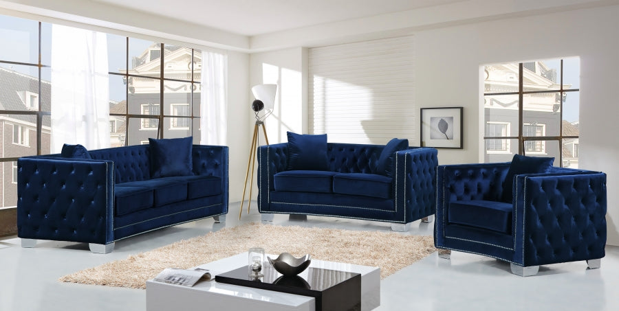 Elegant and eye-catching, the stunning Reese Living Room from Meridian Furniture is the perfect addition to any space. Rich Velvet covers the plush, comfortable seat, padded with high-density foam and modern tufted design on the back and sides. Strength and beauty is guaranteed with a solid wood frame and chrome legs. Featuring a Unique slightly curved design and nail heads.