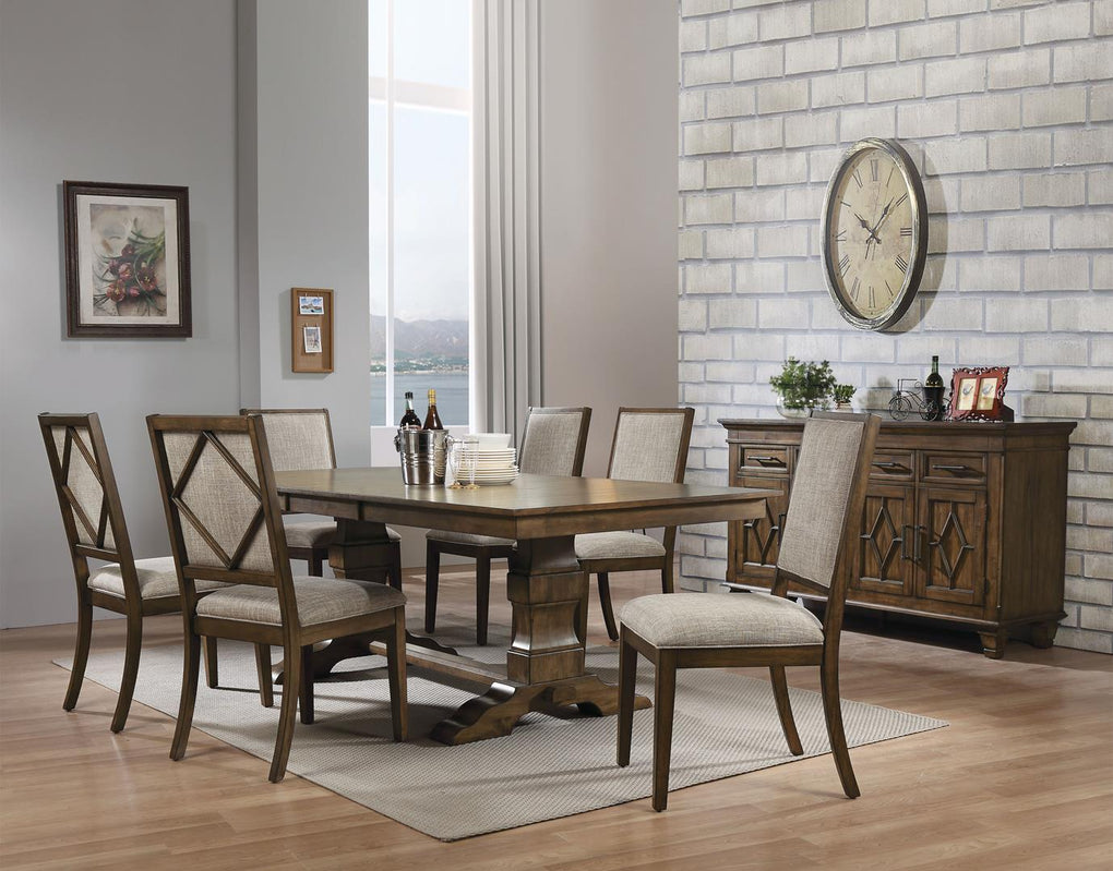The Aurodoti collection features an extended leaf, providing a formal dining group with succinct lattice details. The selected dining pieces carry an oak finish and fabric seat & back chair cushion, which all blend beautifully into your home Decor. Your dining room will shine with sophistication and class with the addition of the Aurodoti collection.