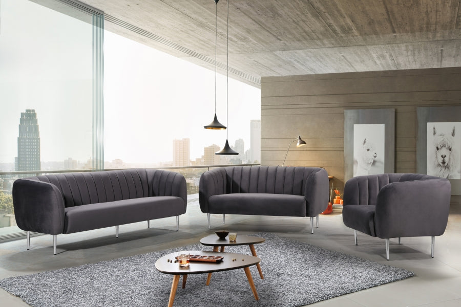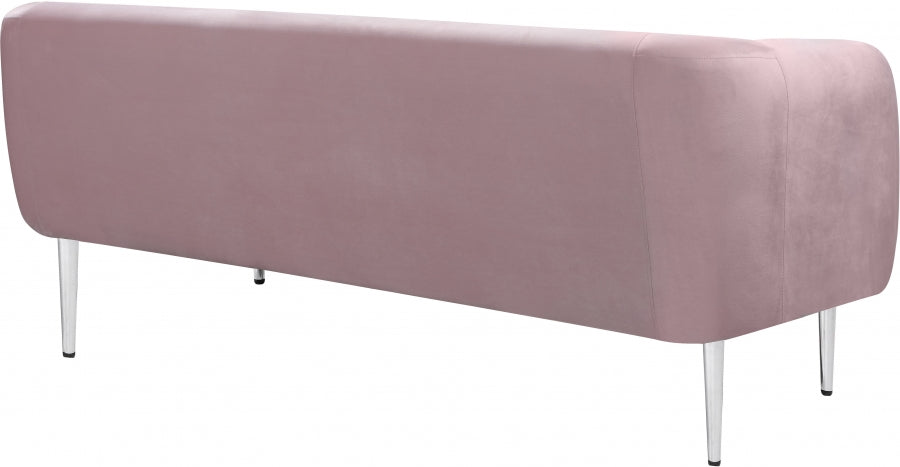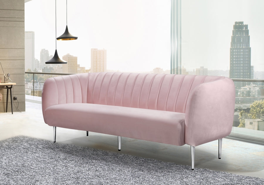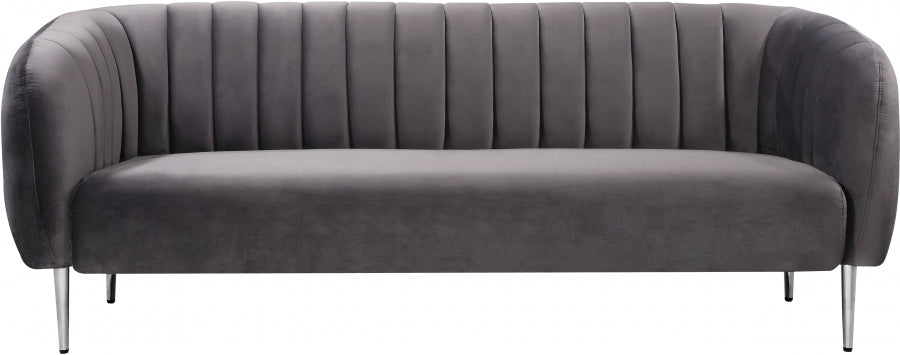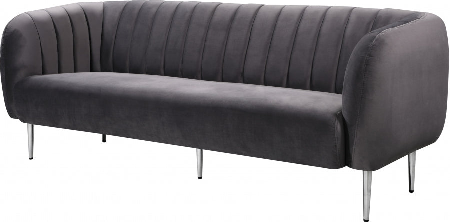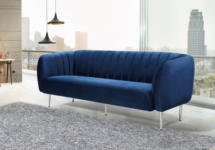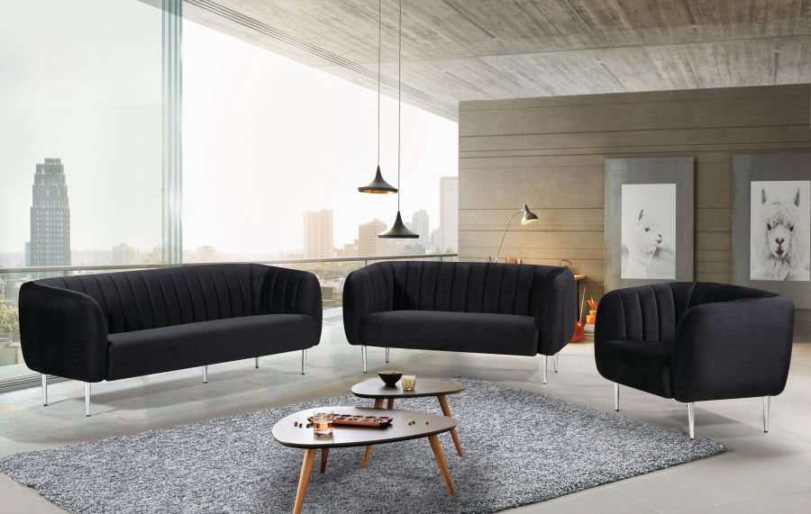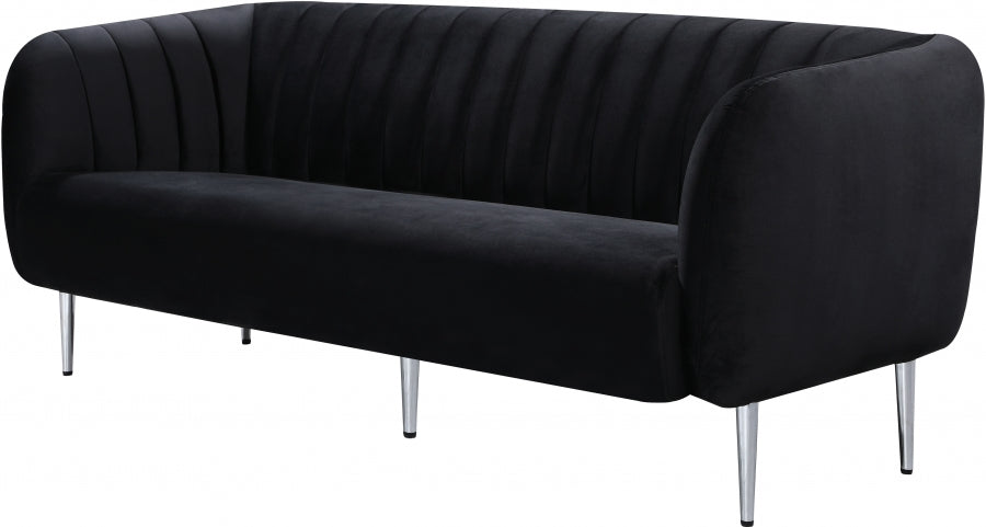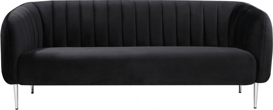 Curl up and get comfy with this Willow Black Velvet Sofa from Meridian Furniture. Plush cushions, a curved design, and rich black velvet upholstery promises utmost relaxation after a long day, while Channel tufting provides additional texture and chic appeal. Chrome metal legs offers the perfect color balance to the sofa's black color, in addition to providing sturdy support while lifting the seat high enough off the floor to make vacuuming beneath it a complete breeze.