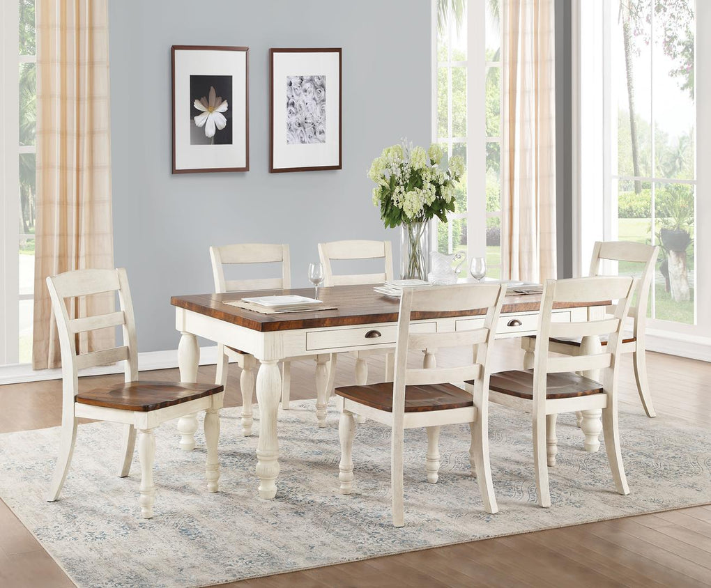 Farmhouse living is characterized by clean simple lines. Appealing as it evokes nostalgia for earlier times. today's farmhouse designs can be traditional, casual or even modern in style. Finished in a walnut with rub through. The horizontal planked top, solid turned legs, and four storage drawers with pewter cup pull, on both side of the table, are perfect for storing napkins, extra placemats, or other dining essentials
