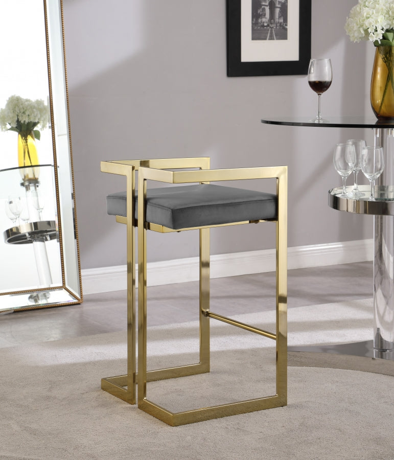 Impress guests with this Ezra Black Velvet Counter Stool. The boxy design is contemporary and uber chic, ensuring that the stool is a good fit in your modern home, whether you use it at the kitchen counter or home bar. A minimalist design makes this no-nonsense stool an unassuming addition to your space. The goldtone metal frame is robust and strong, so it can handle daily use without breaking a sweat. A plump seat cushion tops the stool and is upholstered in black velvet material for a soft, luxe feel.