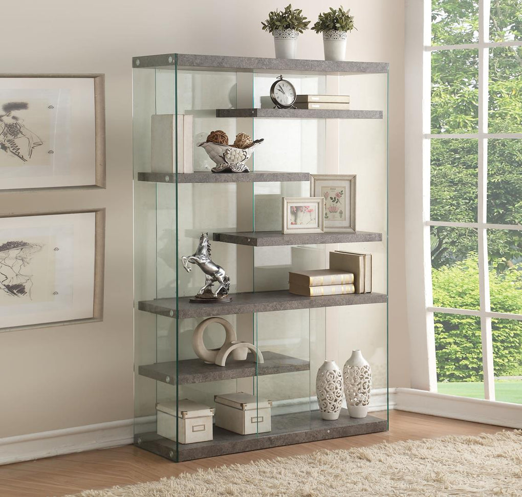 Booyd Bookshelf, Faux Concrete & Clear Glass