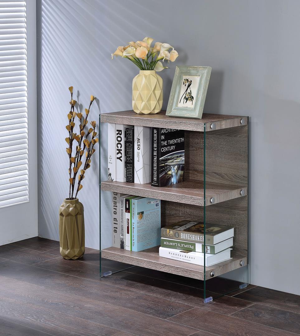 - Wooden Shelves & Back: Gray Oak, Weathered Finish