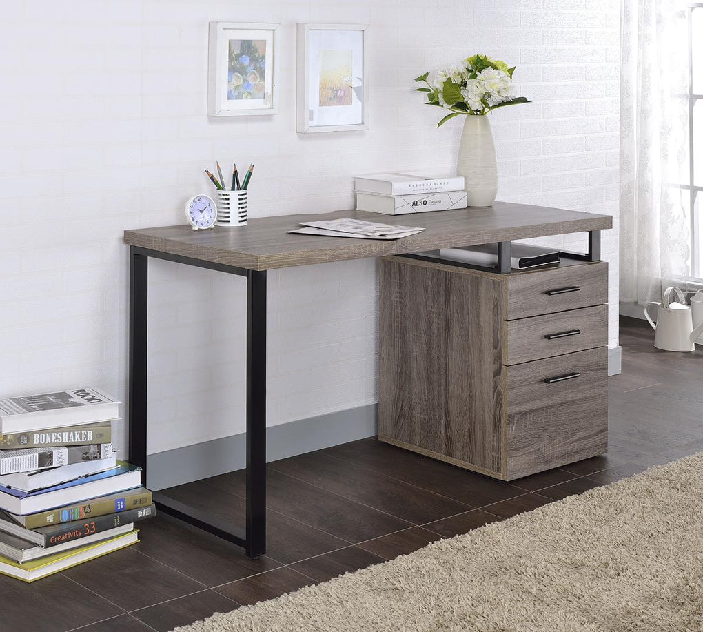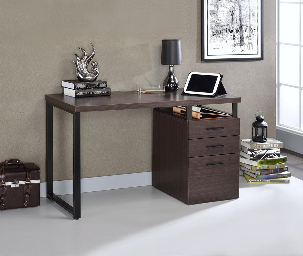 Make your office more organized with this Coy desk. Not only does it have 2 drawers and a bottom file drawer, but an "on hand" opening under the top for the quick access files. Plenty of top surface at 47" x 22" for any set up and a nice combination of dark oak black metal end leg support.