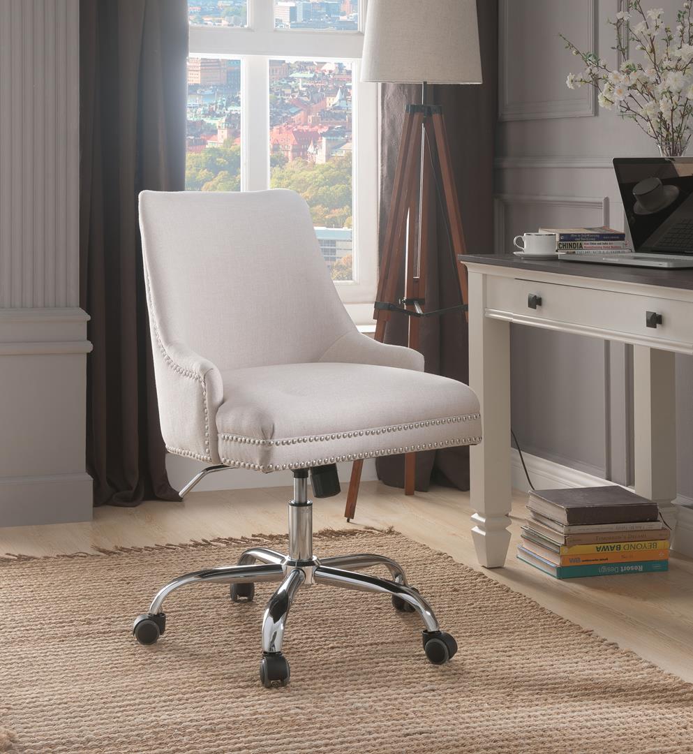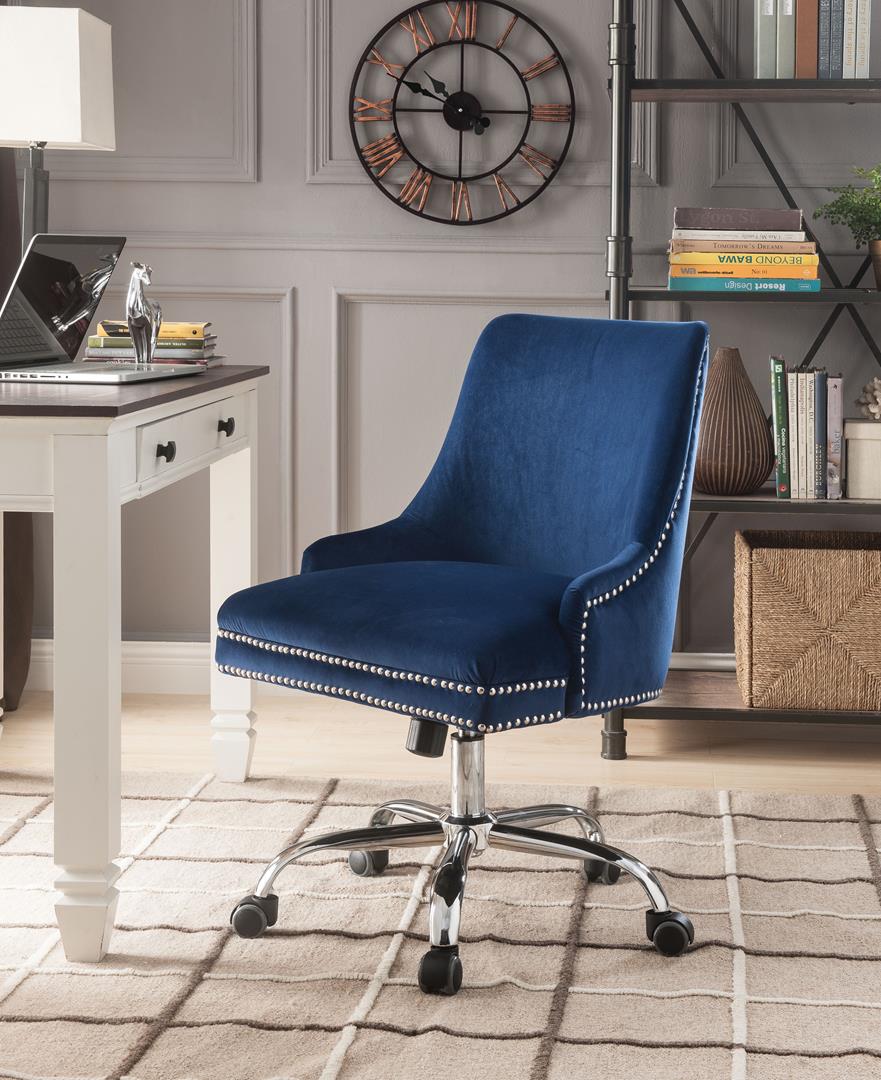 Inspired by the classic wingback chair, our Yuval office chair exudes a clean, timeless elegance with sloped arms and practical chrome legs. The nail-head trim accent around the chair adds instant glamor while the caster wheels and gas-lift offer functionality. This chair offered in blue velvet or beige linen, will instantly elevate your home workspace.