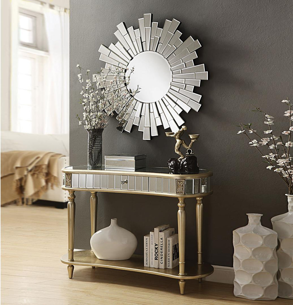 The unique design of the Kaya console table features mirror top and side panel with single drawer in stunning champagne finish. It is made in the Glam style, and will look great in any interior.