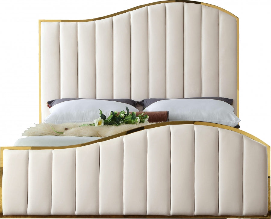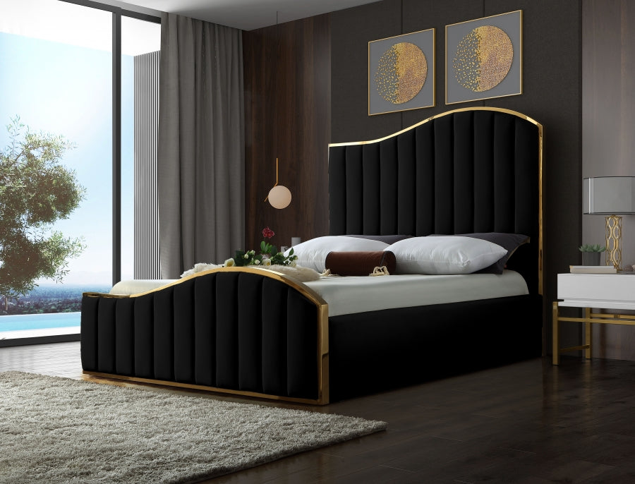 Transform your bedroom into a dream haven with the breathtaking Jolie black velvet king bed. Featuring a stunning polished gold metal frame that supports black velvet upholstery on the headboard and footboard with channel tufting for texture, this sleek bed not only commands your attention, it demands it. The wavy design of the headboard and footboard evokes a dramatic image reminiscent of a boat rolling on the waves at sea, promising to lull you to sleep and reward you with a night of pleasant dreams.
