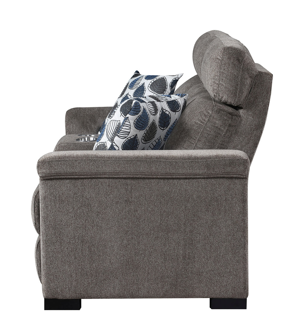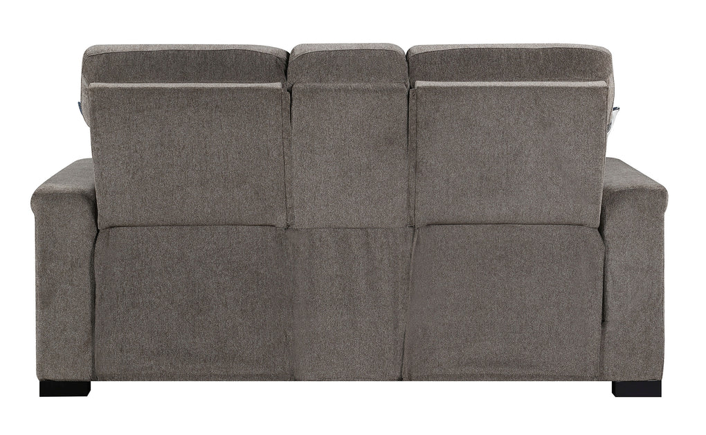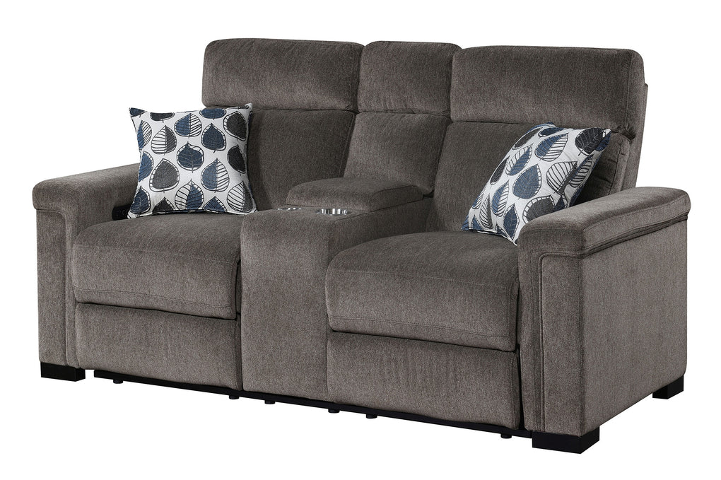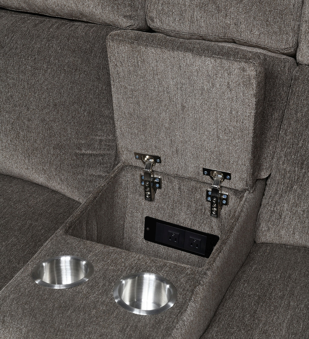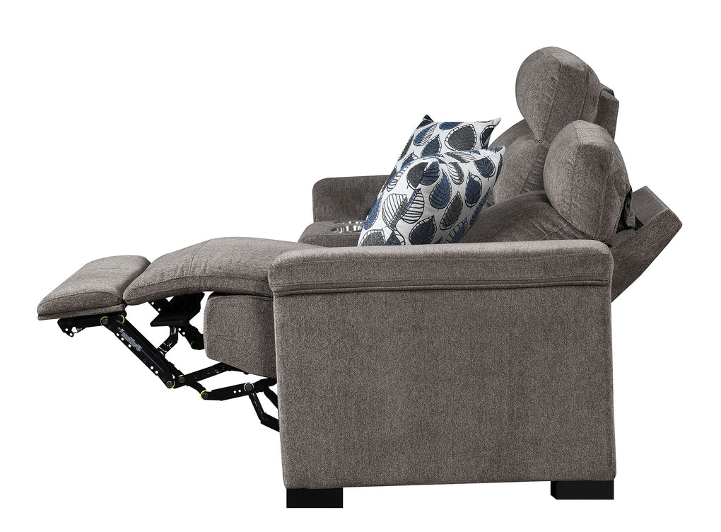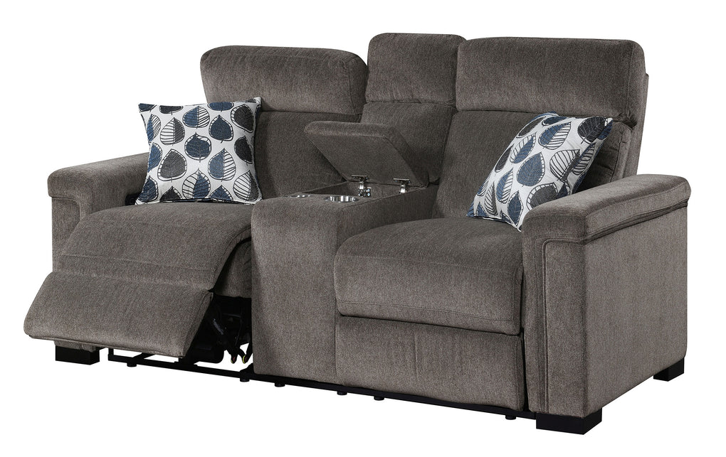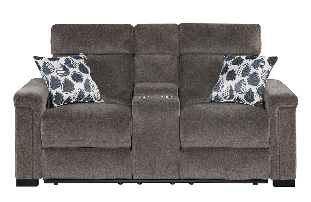Power Reclining loveseat with power headrest, hidden console storage with power outlets, stainless steel cupholders, hidden controls w/USB , and made up in a microdenier chenille with a pair of accent pillows